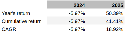As you can see from the table below, 2025 has been a very good year with a return of 50.39%, markedly better than the -5.97% decrease seen in 2024. The cumulative return since inception now stands at 41.41% with a compound annual growth rate of 18.92%.