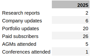 During 2025, I published two new research reports on Jet2 (JET2) and James Latham (LTHM); six company updates on Aviva (AV), Warner Bros. Discovery (WBD), Ecora Resources (ECOR), Fuller, Smith & Turner (FSTA), tinyBuild (TBLD) and Secure Trust Bank (STB); and twenty portfolio updates.