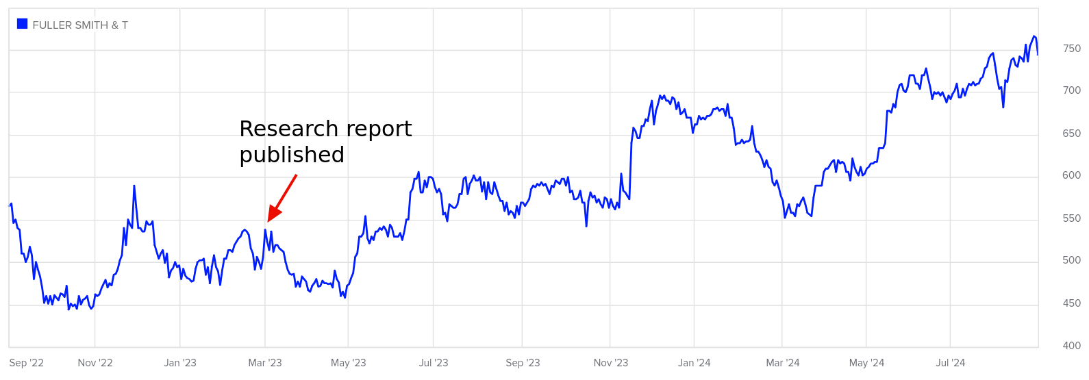 Fuller's has performed pretty well since I first released a report on the company back in Mar 2023. Your mileage will of course vary depending on the timing of entry, but anyone purchasing shares in the Apr 2023 trough will have captured a total return (including dividends) in excess of 60% if held to today. I myself am up around 50% on my average purchase price.