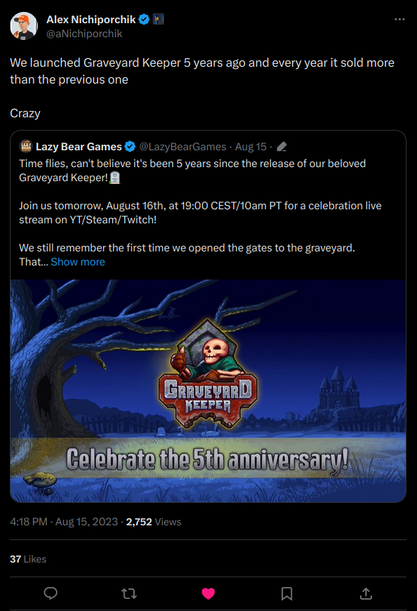 This shows you the enduring sales power of certain back catalogue titles, with Graveyard Keeper making new sales records each year according to management.