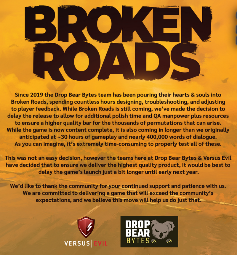 Broken roads was scheduled to release on 14 November, but on the 8th they announced it would be delayed until early next year.