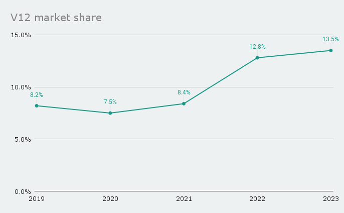 While the overall Retail Finance market in the UK is pretty well the same size today as it was 5 years ago, V12 has grown its share of new business from 8.2% in 2019 to 13.5% in 2023.