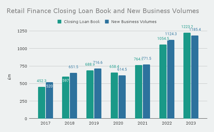 STB's retail finance loan book (net of impairment provisions) has grown from £452.3m in 2017 to £1,223.2m in 2023, equating to a compound annual growth rate (CAGR) of 18.04%. New business volumes have been very similar over this period, demonstrating the relatively short duration of the loans being issued.