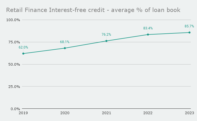 All four have seen lending growth over the the last 5 years, but faster growth from the consumer finance segments has resulted in them increasing their share of lending from 45.5% in 2019 to 51.0% in 2023. This has coincided with a strategic shift in retail finance towards interest free lending, which now makes up 86% of the segment's loan book.