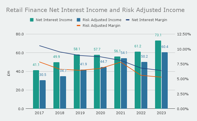 The cost of risk recognised in FY23 was £15.7m, equating to just 0.5% of the loan book. Subtracting this from the operating income gives us the risk adjusted income of £86.1m and risk adjusted margin of 2.8%.