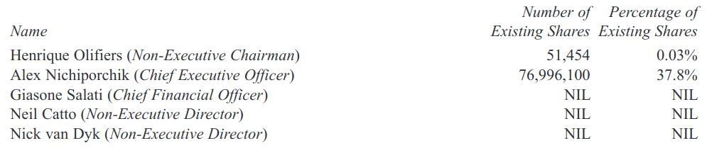 In addition to the above, Alex has a special "Subscription Agreement" wherein his shareholding cannot fall below 37.8% (his current ownership stake) after dilution. In effect this means he is entitled to subscribe to a sufficient number of the shares issued in the placing to maintain his ownership at 37.8%.